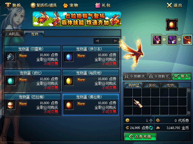 商城内容和细节介绍,包含DNF70版本的原版宠物。